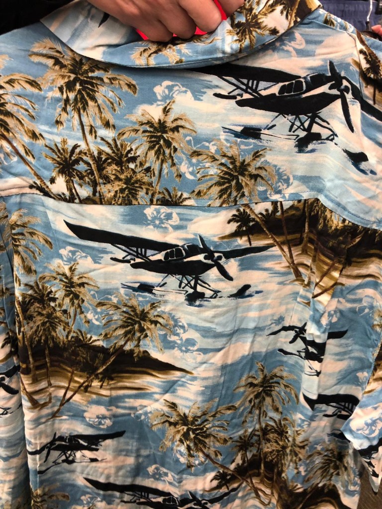 It’s unusual to find airplanes (rather than boats) on Hawaiian style casual shirts….